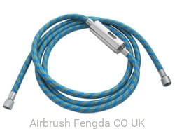 Blue air hose with integrated metal condensation filter (BD-12) designed to be connected to all Fengda airbrush guns and compressors with connection size G1/8 (e.g. Fengda AS-16, AS-16-1, AS-18(B), AS-19(B), AS-176, AS-186(A), AS-189(A), AS-196(A)).