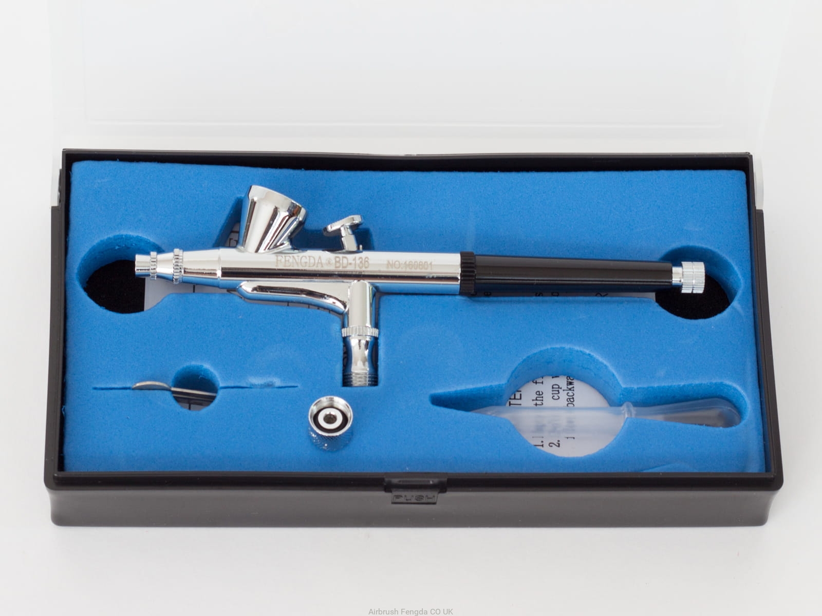Fengda BD-136B universal steel top filling dual function Airbrush spray gun (stage one turns on the air and stage two regulates amount of paint). Supplied in a plastic box.