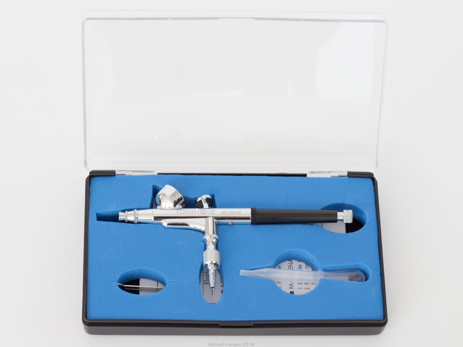 Fengda® BD-137A universal steel top filling dual function Airbrush spray gun (stage one turns on the air and stage two regulates amount of paint) with an intergrated cup. Supplied in a plastic box.
