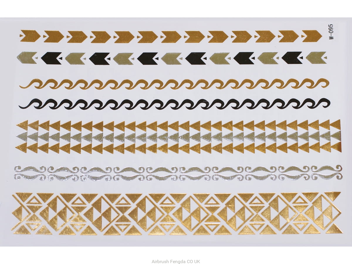 Gold Silver Metallic Flash Temporary Waterproof Tattoo Stickers inspired by Jewelry (bracelets, necklaces, rings, suspenders, Indian, African, Egyptian, geometric and other motifs),which lasts 3-5 days you can apply and remove by following simple guide: