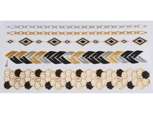 Złote a srebrne tymczasowe wodoodporne tatuażowe naklejki inspirowane biżuteria (bransoletkami, naszyjnikami, pierścionkami, indyjskie, afrykańskie, egipskie, motywy geometryczne i inne), tatuaż wytrzyma 3-5 dni, dla aplikacji i usunięcia przygotowaliśmy dla Was poradnik: