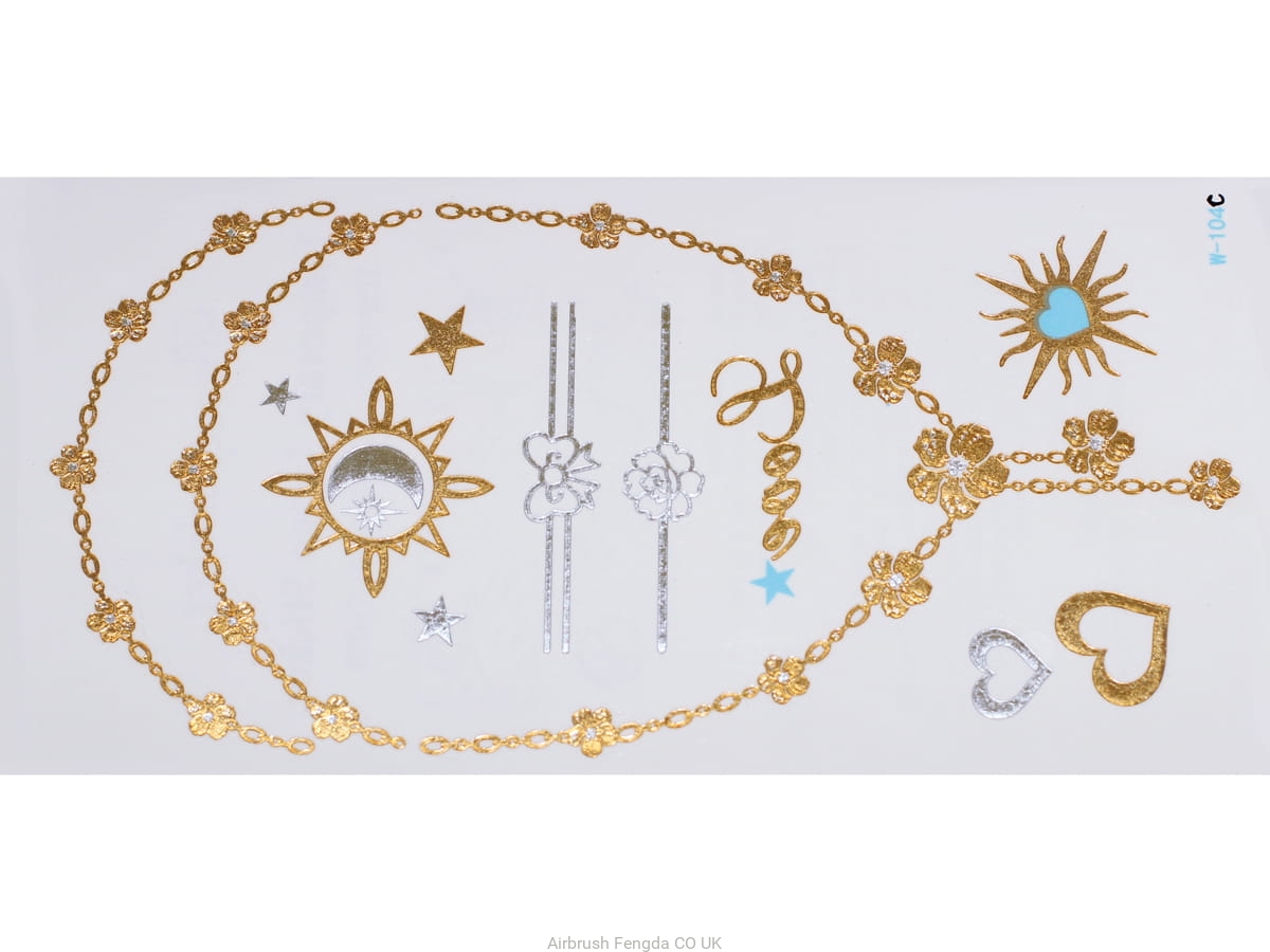 Gold Silver Metallic Flash Temporary Waterproof Tattoo Stickers inspired by Jewelry (bracelets, necklaces, rings, suspenders, Indian, African, Egyptian, geometric and other motifs),which lasts 3-5 days you can apply and remove by following simple guide: